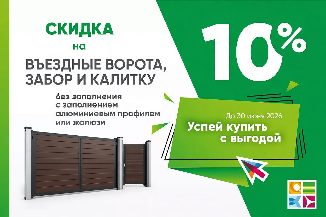 Если вы планируете установить или обновить ограждение участка в 2026 году — сейчас самое выгодное время! До 30 июня 2026 года включительно у всех официальных представителей АЛЮТЕХ действует специальная акция: скидка 10% на весь комплекс ограждения — откатные и распашные ворота, заборы и калитки.